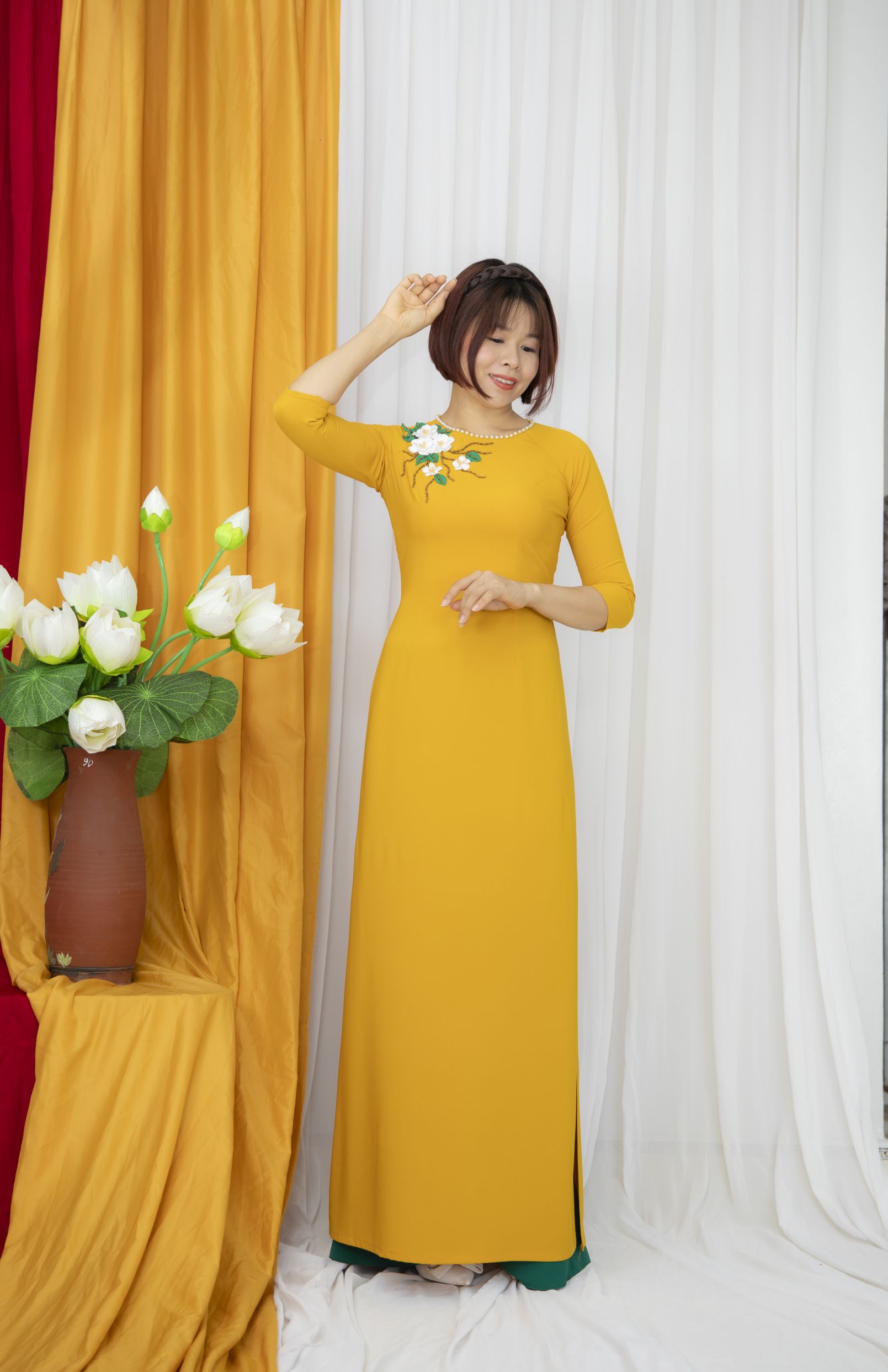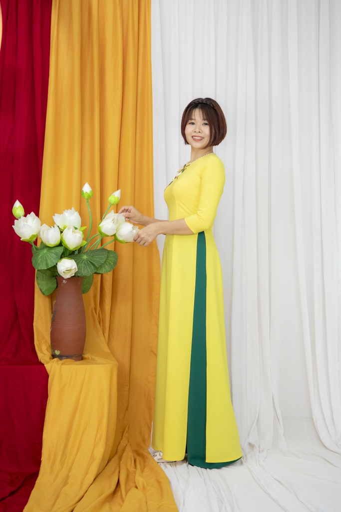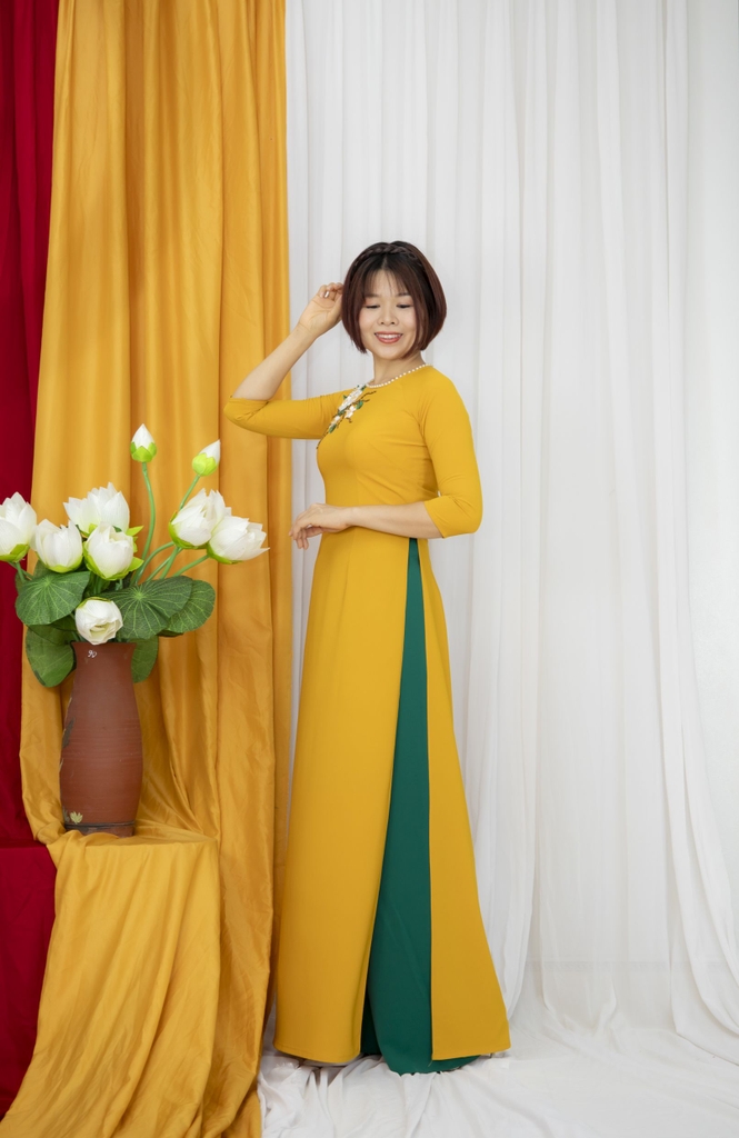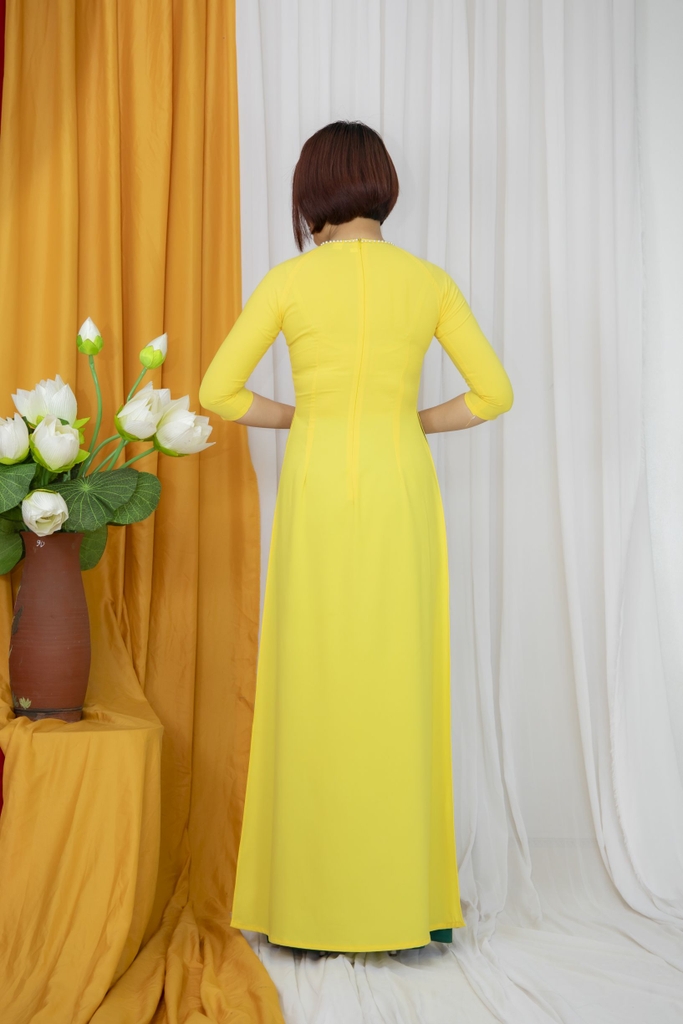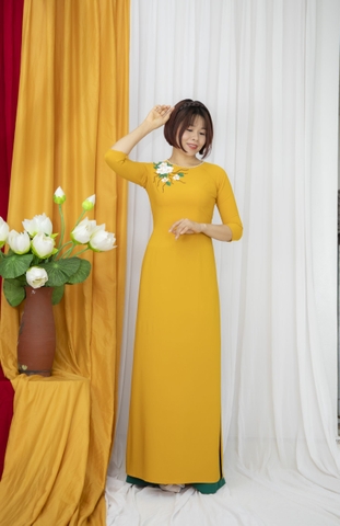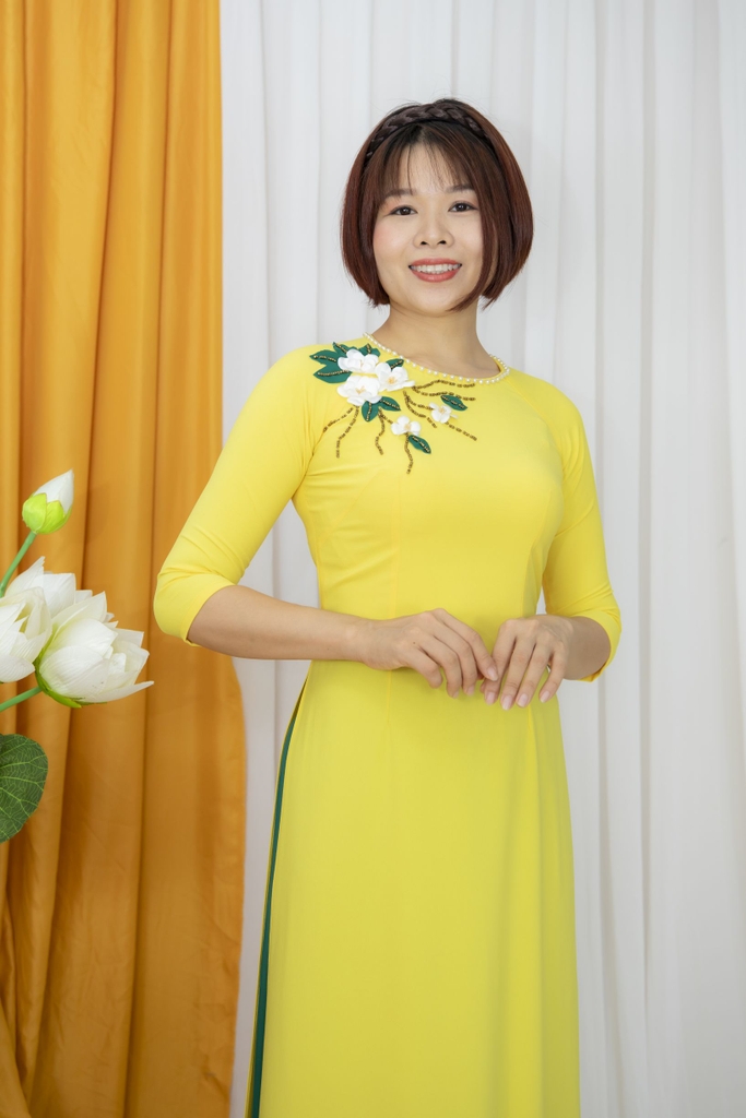 Kiểu dáng: Tà A rộng dài, áo thiết kế cổ tròn tay lỡ, phối màu hài hoà và thêm bông hoa nổi nhẹ nhàng tinh tế