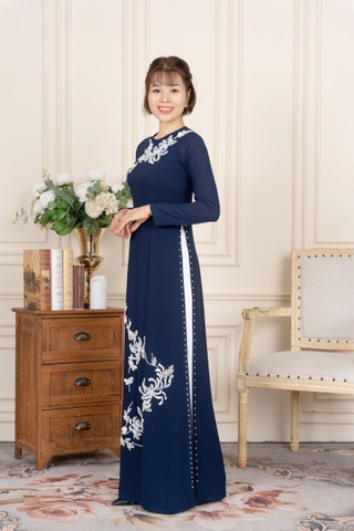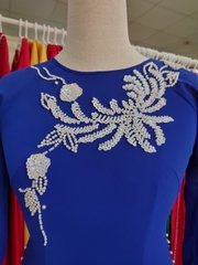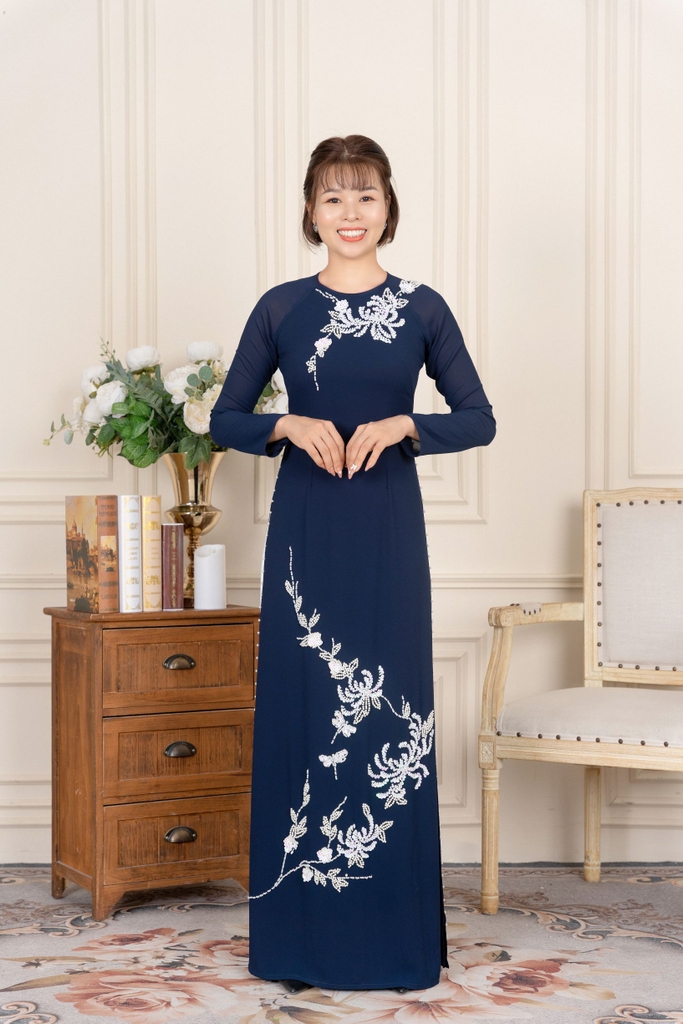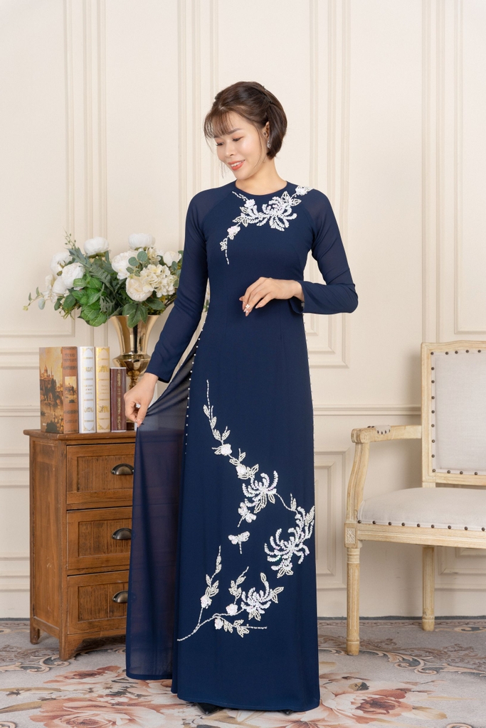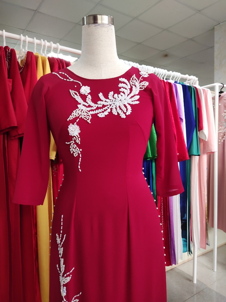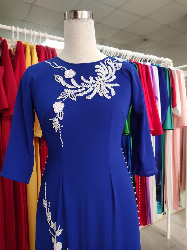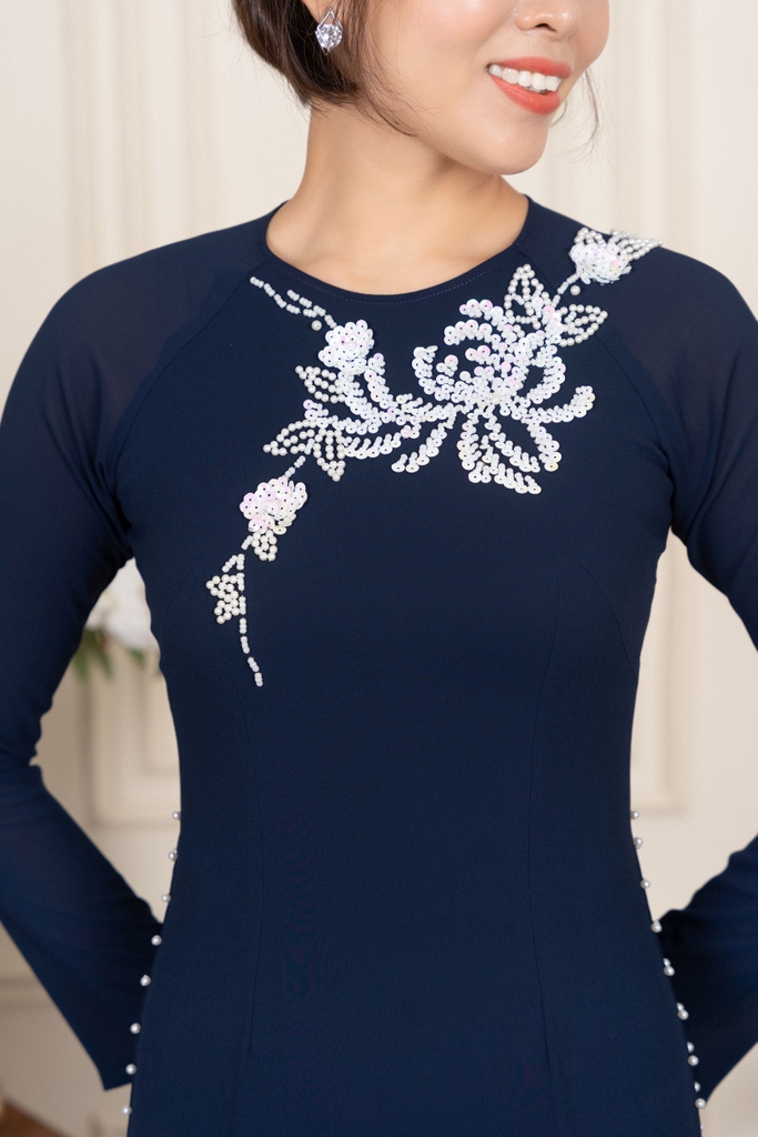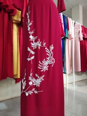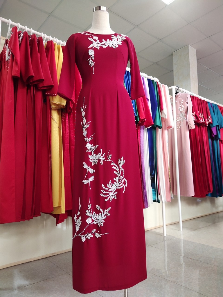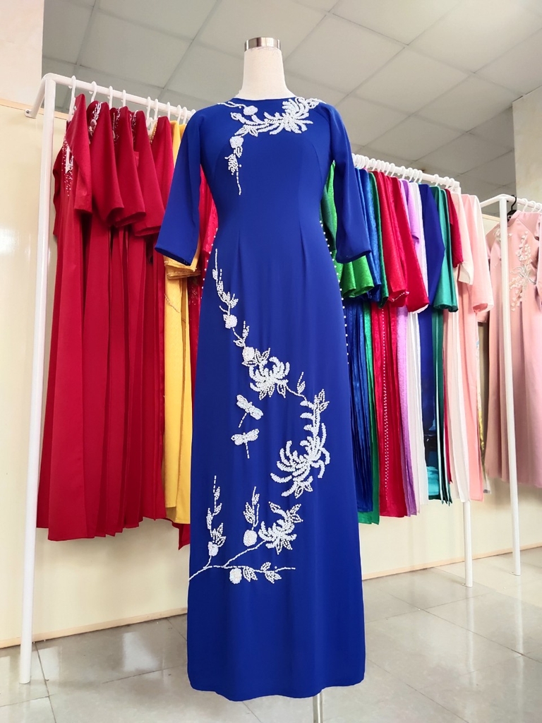 Kiểu dáng: Tà A rộng dài, áo thiết kế cổ tròn tay dài đính kết hạt cườm, ngọc trai, kim sa.Áo