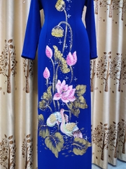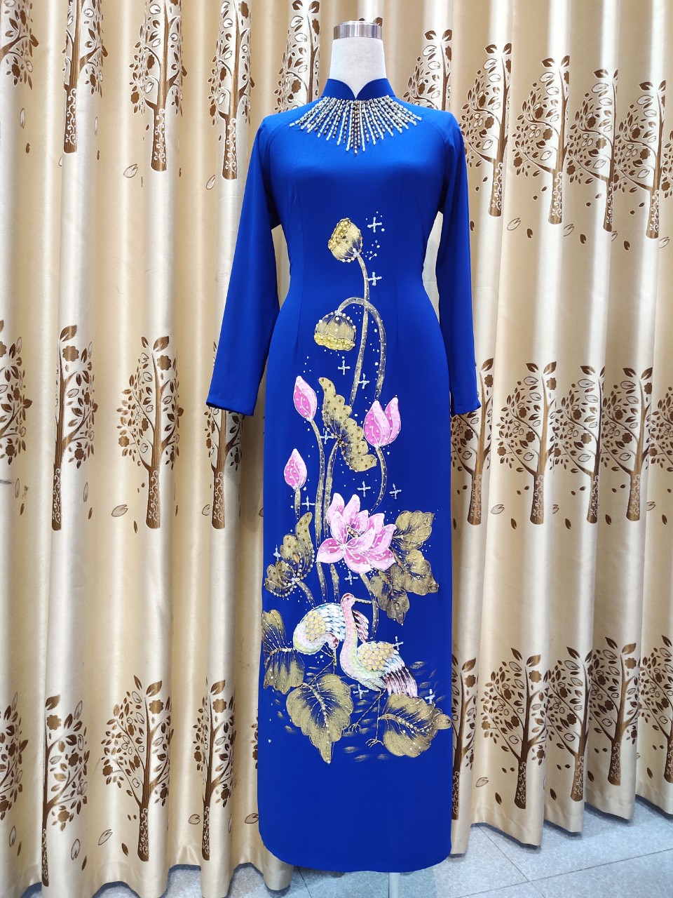 Kiểu dáng: Tà A rộng dài, áo thiết kế cổ 2,5cm được hoạ sĩ vẽ tay bằng sơn chuyên dụng trên vải áo dài. Đem đến một vẻ đẹp hài hoà và không bị đụng hàng.